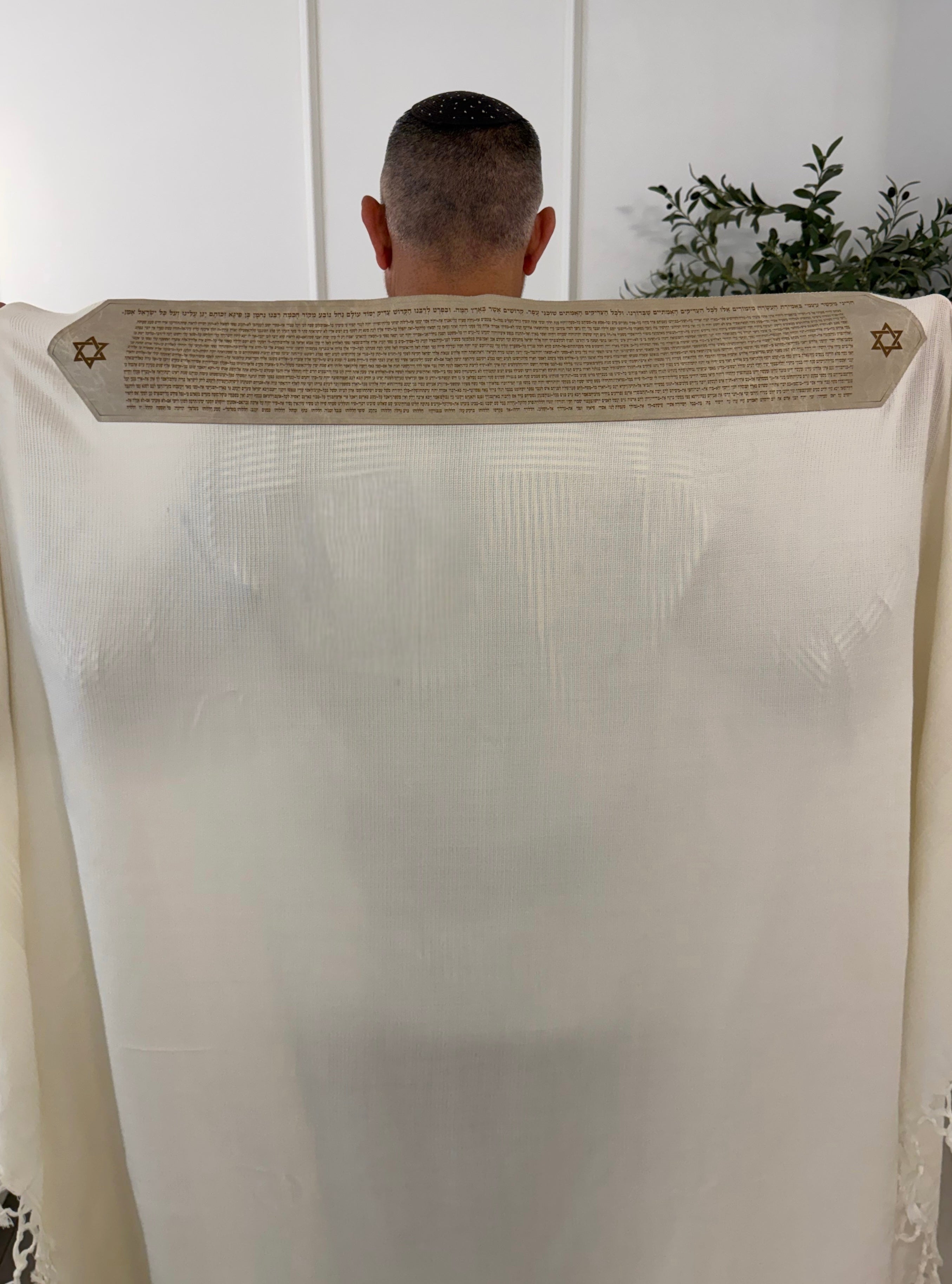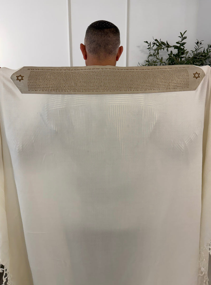 טלית צמר Premium דגם התיקון הכללי מבית אורייתא – עשויה 100% צמר רחלים טהור (בית יוסף) בטקסטורת בד תשבץ יוקרתית המונעת החלקה. הטלית מעוטרת בעטרה מבד דמוי עור בגוון חום עם חריטת לייזר של "התיקון הכללי", פינות מגן דוד בחיתוך לייזר וציציות פתיל עבה עבודת יד בקשירה ספרדית מהודרת