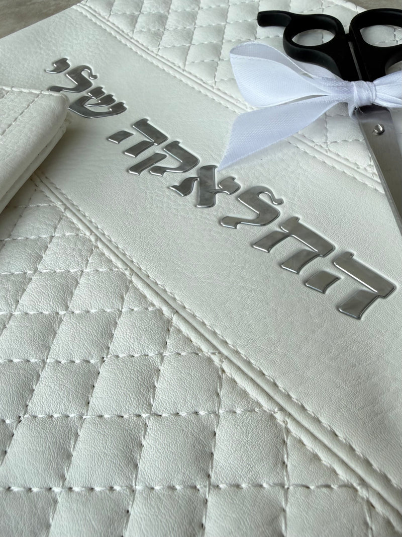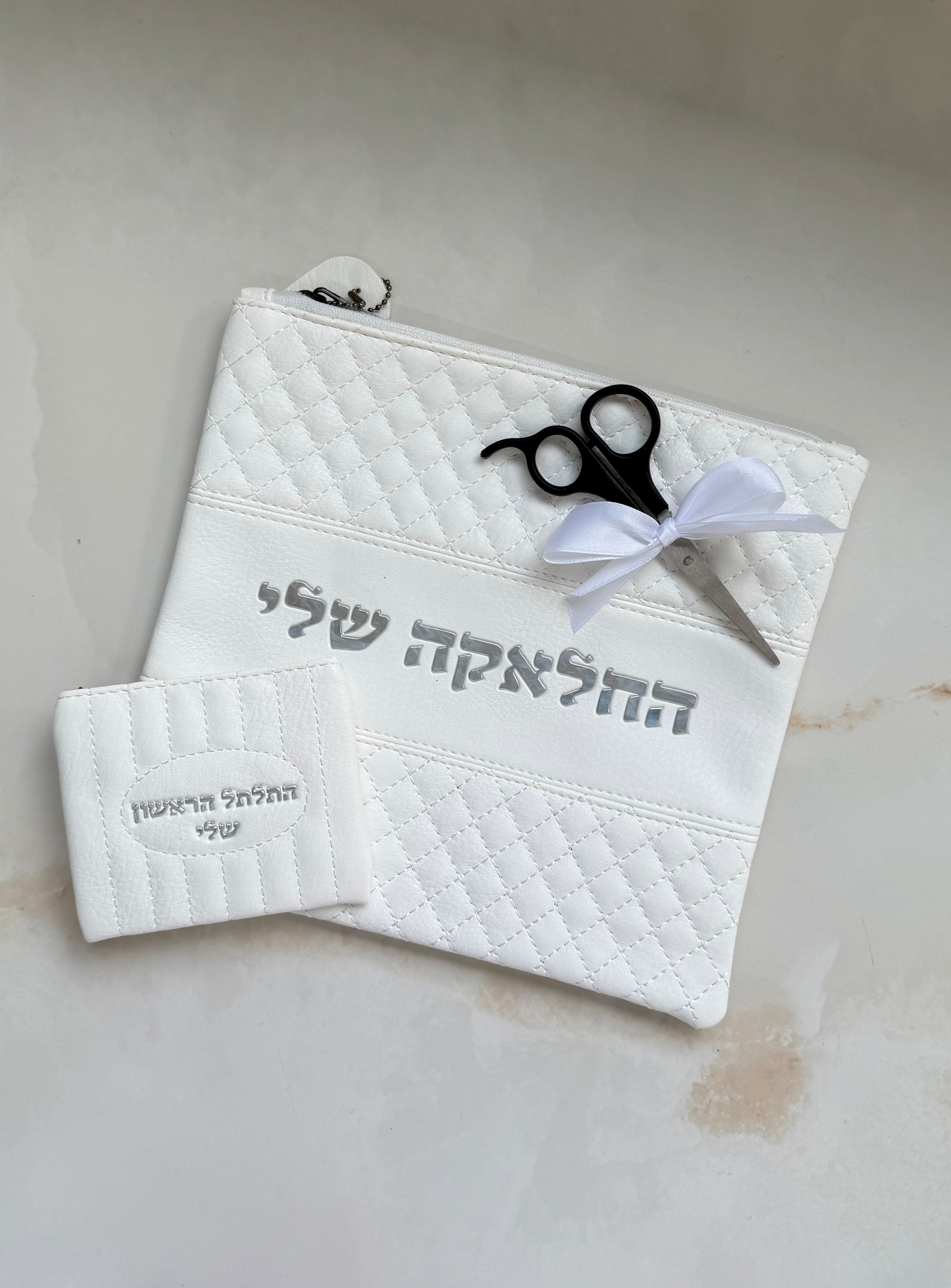 כיסוי לטלית חלאקה עשוי דמוי עור איכותי עם אותיות בולטות, הכיסוי מגיע עם נרתיק "התלתל הראשון שלי" ומספריים