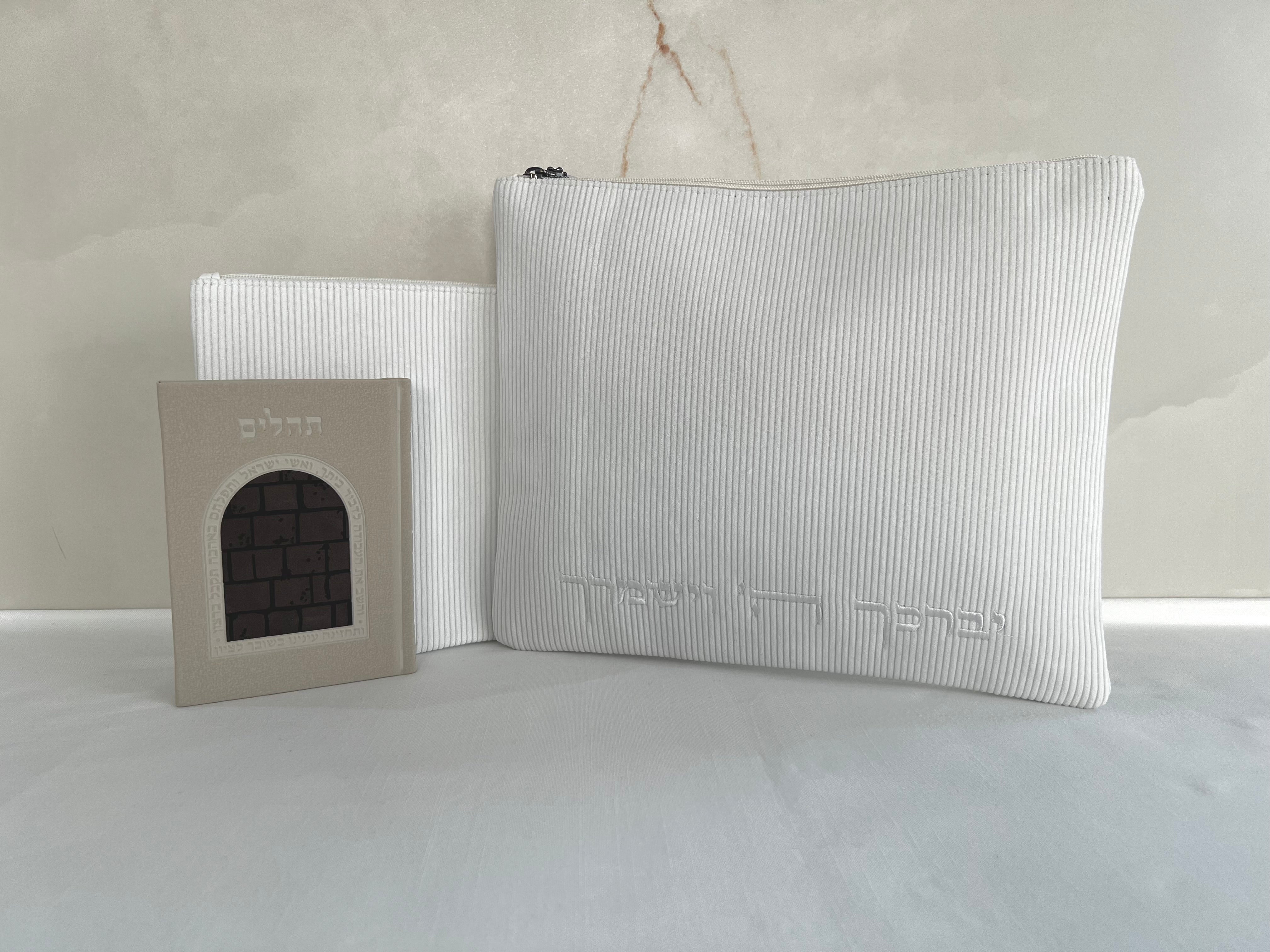 מארז כיסוי טלית ותפילין דגם קורדרוי לבן, בתוספת ספר תהילים בצבע בז' עם כריכת דמוי עור משובחת