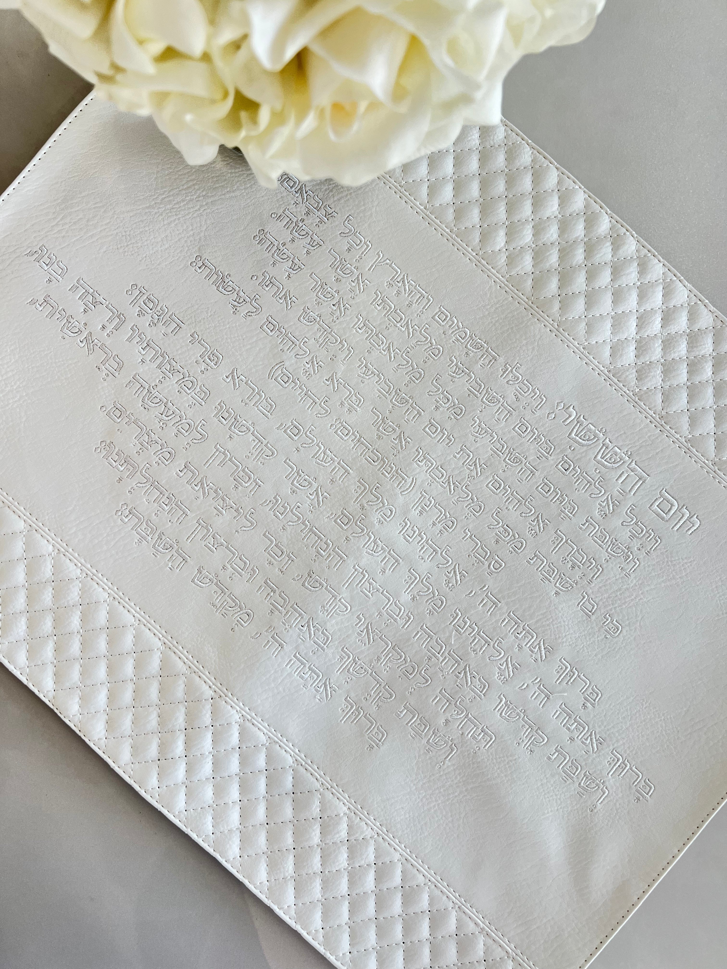כיסוי חלה דמוי עור, עם רקמת "יום השישי" בצבע לבן