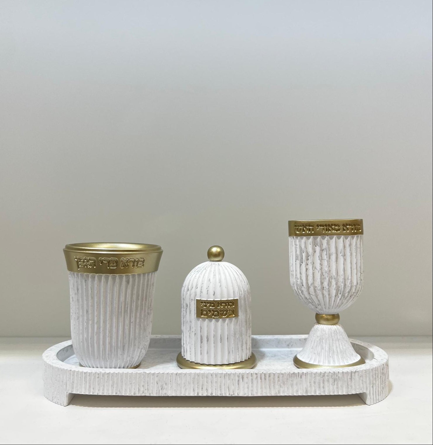 סט הבדלה מהודר לבן וזהב, הסט מגיע: מגש מלבני בעל רגליות, כלי לבשמים, מעמד לנר, כוס יין