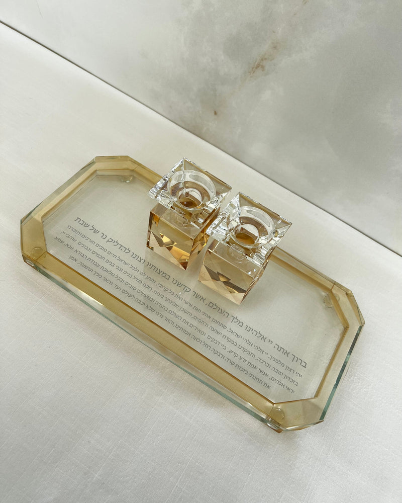 מארז פמוטי קריסטל בצבע זהב ושקוף עם מגש מהודר וכיתוב ברכת הדלקת נרות שבת, בתוספת ברכון הדלקת נרות לבן, עם מגוון ברכות לפרנסה, לבריאות, לילדים ועוד.